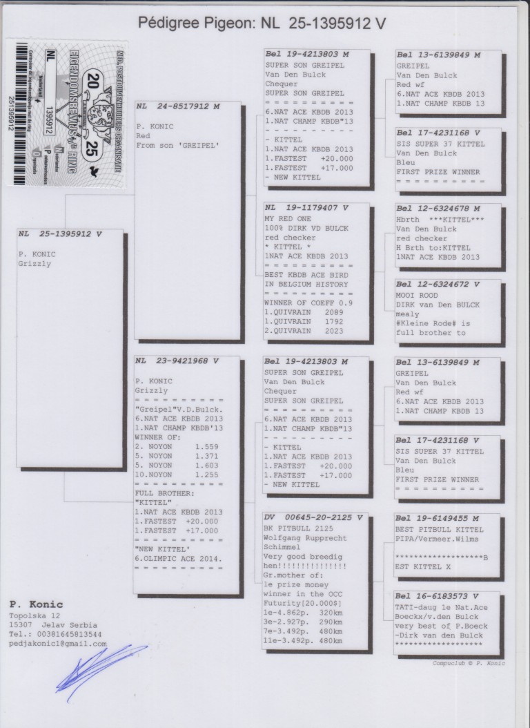 Uit: ”De 912”, uit zoon ”Greipel”, 6. Nat. Asduif Sprint KBDB & broer ”Kittel”, 1. Nat. Asduif Sprint KBDB x ”Greipel 968”, uit zoon ”Greipel”, 6. Nat. Asduif KBDB, lijn ”Pitbull”, legendarische kweker & nazaten 6x 1. Nat. Asduif