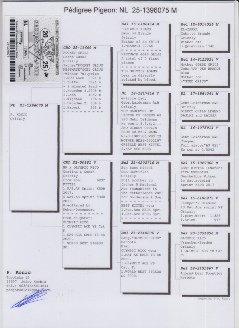Uit: ”Rocket Grijs”, zoon ”Grizli Adams”, Unieke OLR topkweker & nestbroer ”Goed Grijs” x ”BK x Olympic Rico”, uit zoon ”Best Kittel”, 1. & 4. Nat. Asduif KBDB, uit dochter ”Olympic Rico”, 1. Nat. Asduif KBDB & 1. Int. Asduif