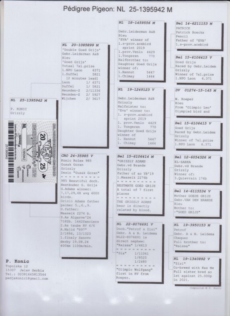Uit: ”Double Goed Grijs”, uit zoon & dochter ”Goed Grijs”, 7x 1. Prijs & 1. NPO Laon 6.371 d., nazaten winnen 7x 1. Nat. Asduif x ”Konic Rolex 985”, dochter ”Grizli Adams”, nestbroer ”Goed Grijs” & zelf unieke OLR kweker