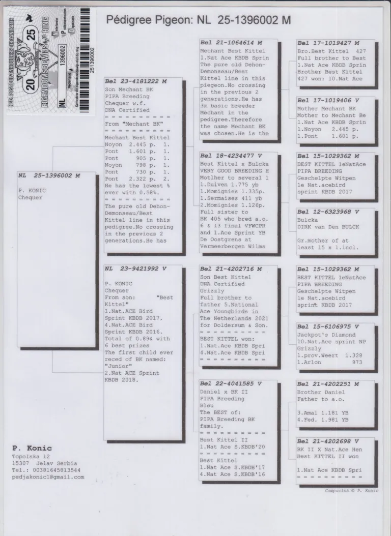Uit: ”Son Méchant BK”, zoon ”Méchant Best Kittel”, 1. Nat. Asduif KBDB, gr-vader 1. Extra Finale OLR PIPR Pattaya, uit dtr. ”Best Kittel”, 1. & 4. Nat. Asduif KBDB x ”Grdtr. Best Kittel”, uit zoon ”Best Kittel”, 1. & 4. Nat. Asduif KBDB
