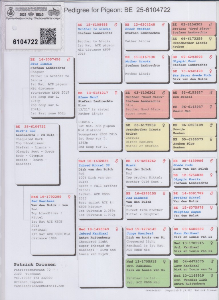 Uit: ”Blue Lincia”, uit broer ”Lincia”, 1. Nat. Asduif KBDB x ”Red Kannibaal”, inteelt ”Kannibaal”, 1. Nat. Asduif KBDB, uit klz. ”Olympic Rosita”, 1. Olympiade duif Cat. Sprint & moeder ”Kittel”, 1. Nat. Asduif Sprint KBDB