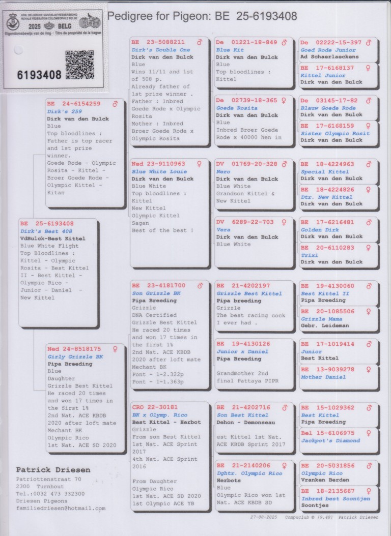 Uit: ”Dirk’s 259”, lijn ”Olympic Rosita”, ”Goede Rode”, ”Kittel”, ”Olympic Kittel”, ”New Kittel”, etc. x ”Girly Grizzle BK”, uit zoon ”Grizzle Best Kittel”, 2. Nat. Asduif KBDB, uit kld. ”Best Kittel” & ”Olympic Rico”