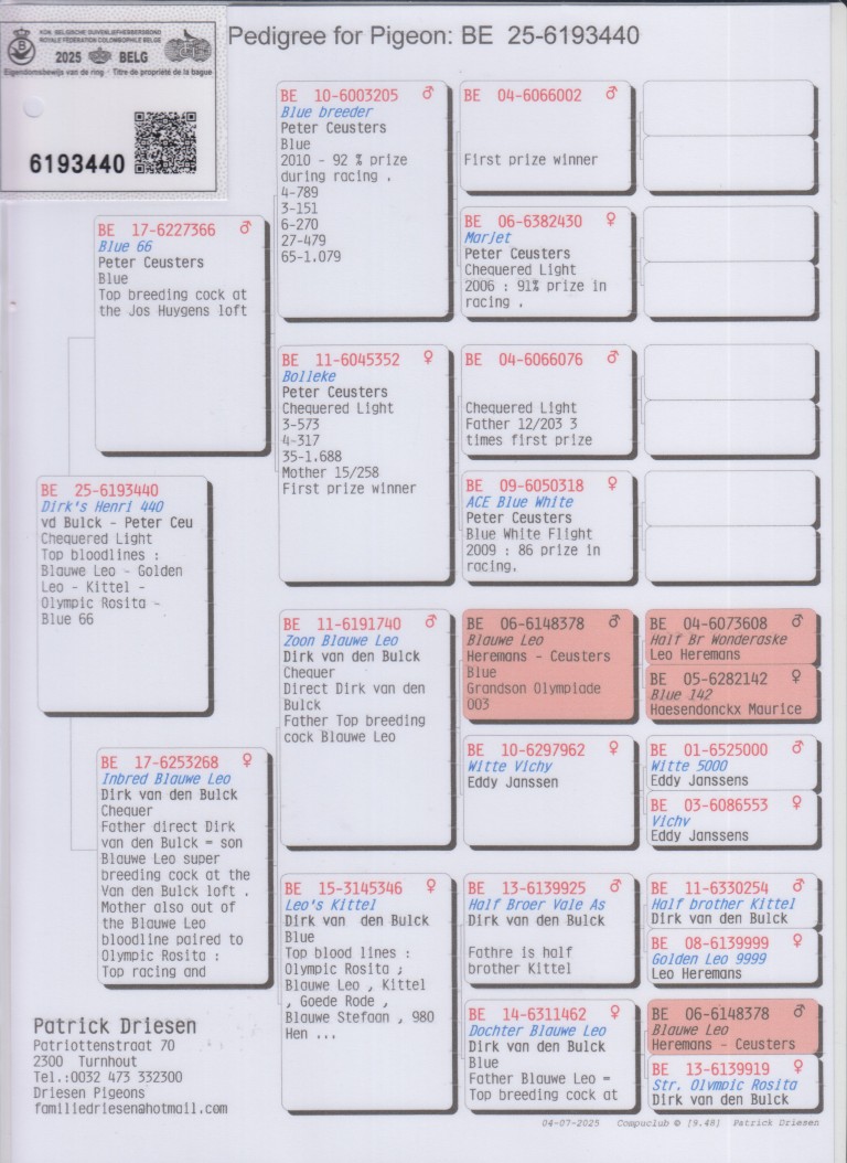 Lot 5: BE25-6193440. ‘Dirk’s Henri 440’, Van den Bulck – Peter Ceusters