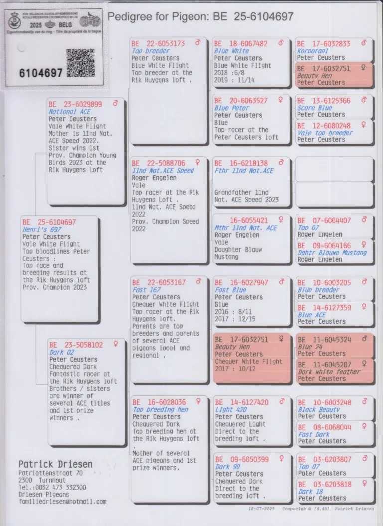 Uit: ”National Ace”, Peter Ceusters, zoon ”11. Nat. Ace Speed”, 1. Prov. & 11. Nat. Asduif Sprint KBDB x ”Dark 02”, Peter Ceusters, uit zoon ”Fast Blue” & ”Beauty Hen”, uit dochter ”Light 420” & ”Dark 99”