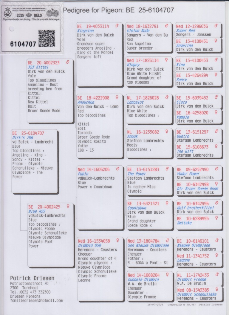 Uit: ”323 Kittel”, lijn ”Bolt”, ”Olympic Rosita”, 1. Olympiade duif, ”New Kittel”, ”Kittel”, ”Broer Goede Rode” & ”Angelina” x ”Blue 425”, lijn ”Olympic Froome”, ”Olympic Schanulleke”, ”Olympic Poot” & ”Nieuwe Olympiade”