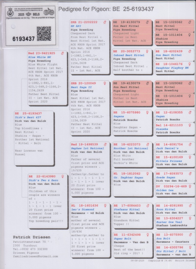Uit: ”Blue White BK”, uit klz. x kld. ”Best Kittel”, 1. & 4. Nat. Asduif Sprint KBDB & Unieke Stamvader x ”Dirk’s Two & Zero”, dochter Superkoppel ouders van 20x + 1. Prijs Winnaars, lijn ”Bolt”, ”Sagan” & ”Kittel”