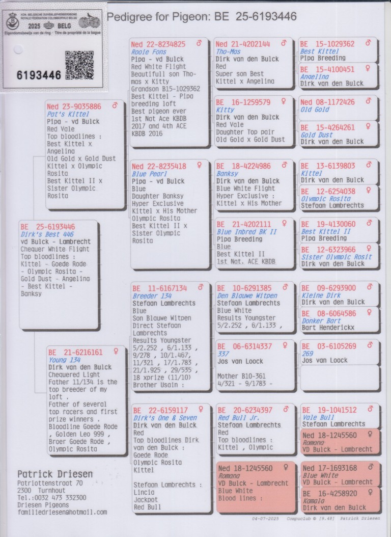 Uit: ”Pat’s Kittel”, inteelt ”Best Kittel”, 1. & 4. Nat. Asduif KBDB, uit kld. ”Kittel”, 1. Nat. Asduif KBDB, uit kld. ”Best Kittel II”, 1. Nat. Asduif KBDB x ”Young 134”, 50% Stefaan Lambrechts, 50% Dirk v/d Bulck