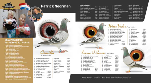 Een exclusieve selectie van slechts 7 duiven uit Patricks absolute topduiven, afkomstig uit zijn supersterren zoals “Seven-O-Seven”, “Witte Veder”, “Maan”, “Renox”, “Camilla” en meer.