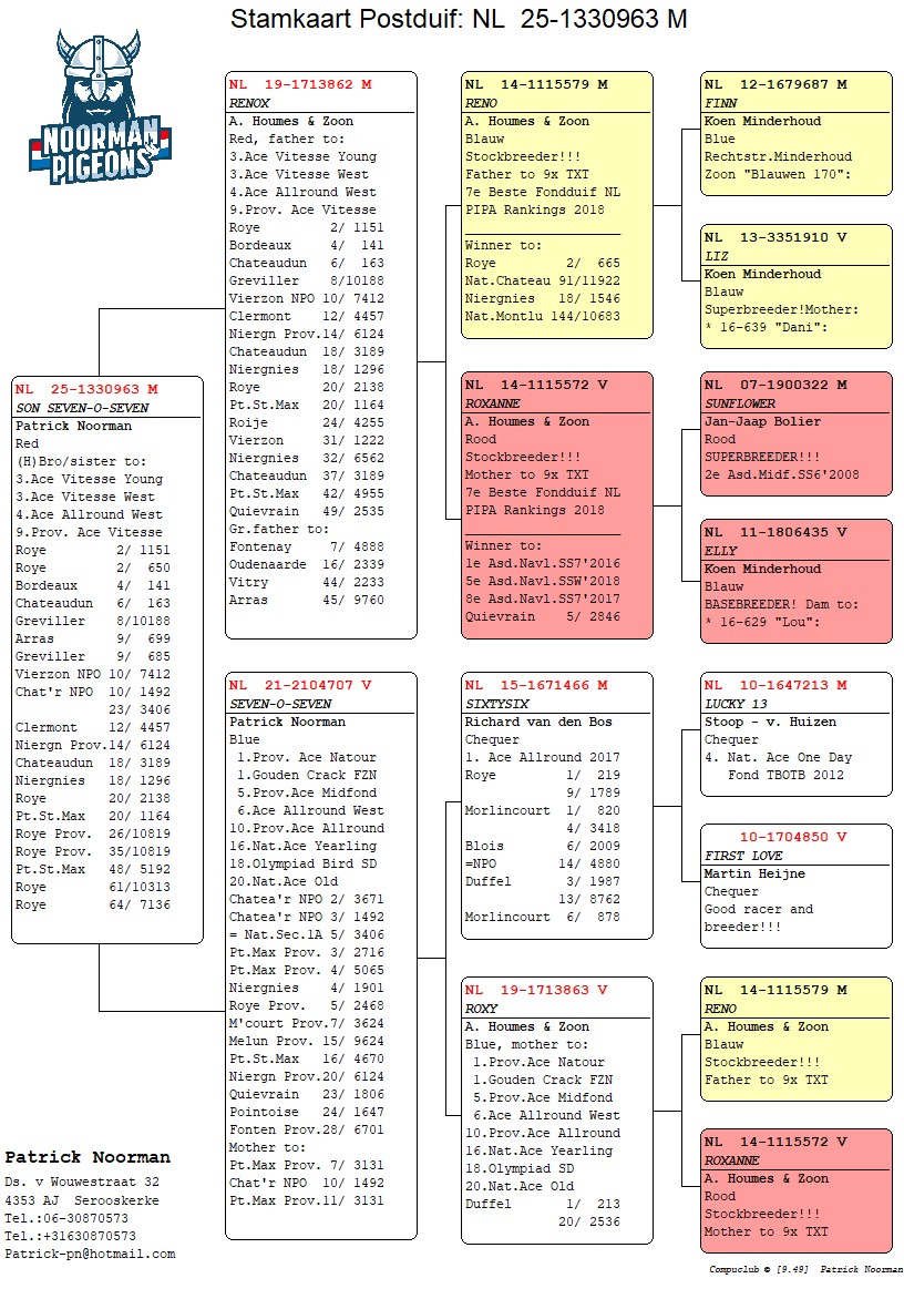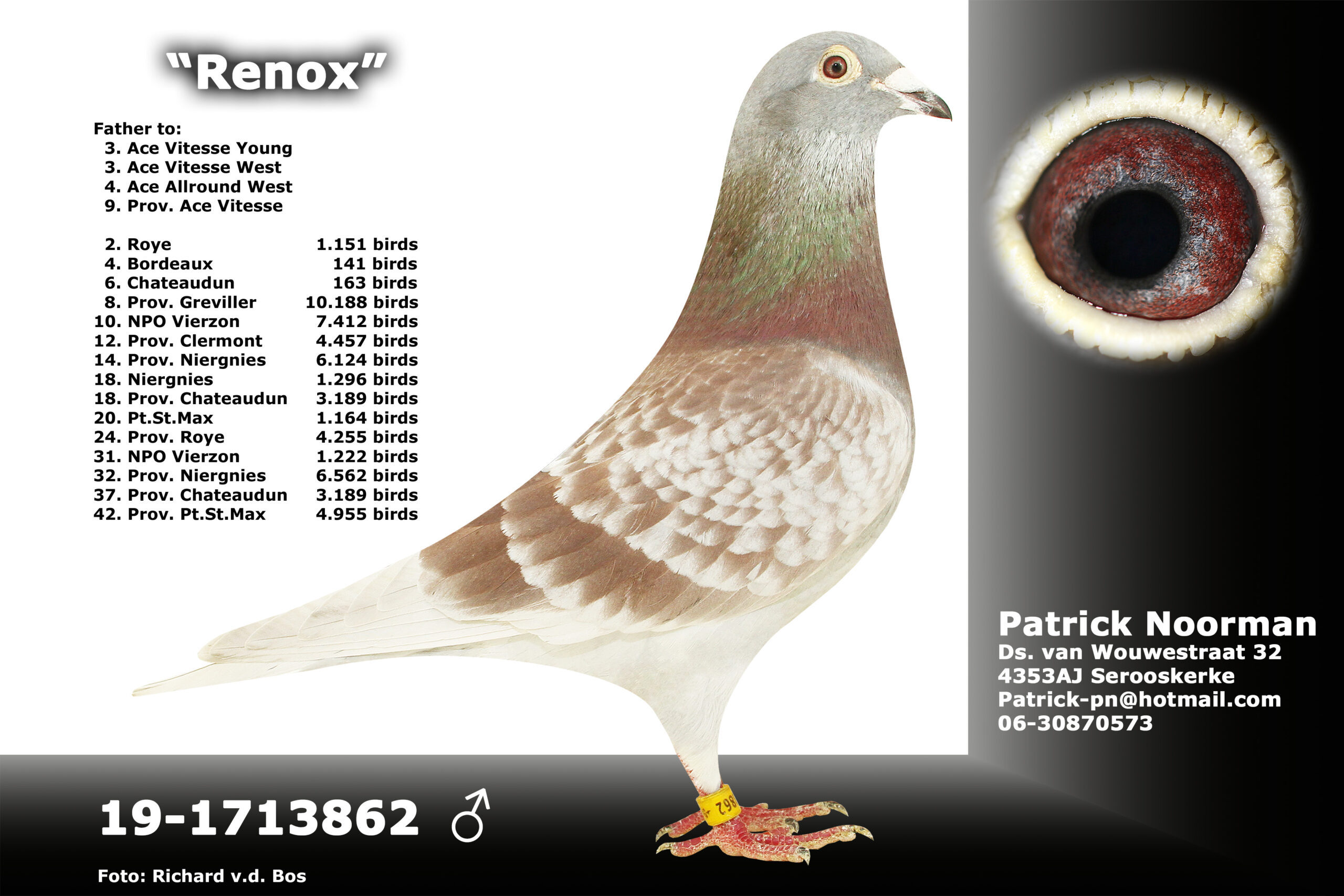 Uit: ”Renox”, 9. Prov. Asduif Vitesse, 2.-1.151 d., zoon ”Reno” & ”Roxanne” x ”Seven-O-Seven”, 1. Gouden Crack Dagfond, 1. Prov. Asduif Natour, 2. NPO 3.671 d., 3. Prov. 2.716 d., 4. Prov. 5.065 d., 5. Nat. 3.406 d., 5. Prov. 2.468 d.