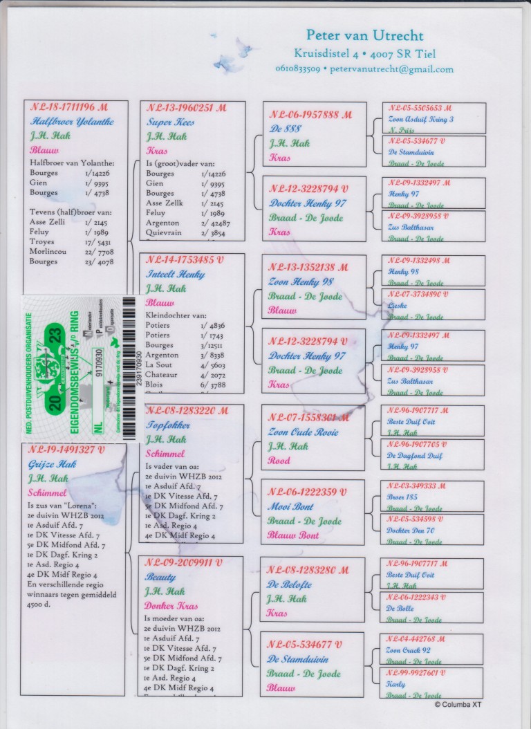 Uit: ”Halfbroer Yolanthe”, 1/2 broer ”Yolanthe”, 1. NPO Bourges 14.226 d., 1. NPO Gien 9.395 d., 1/2 broer 1.-2.145 d., 1.-1.989 d. x ”Grijze Hak”, zus ”Lorena”, 1. Prov. Asduif Allround, 1. Prov. Asduif Vitesse, 2. Nat. Asduif WHZB