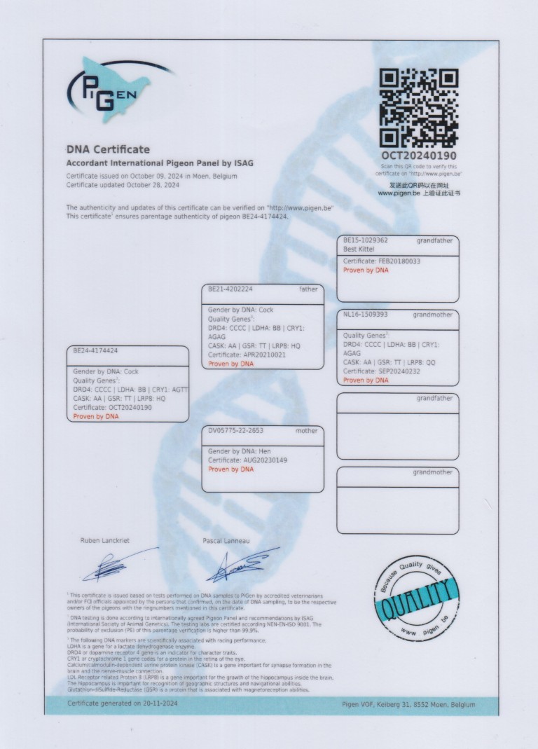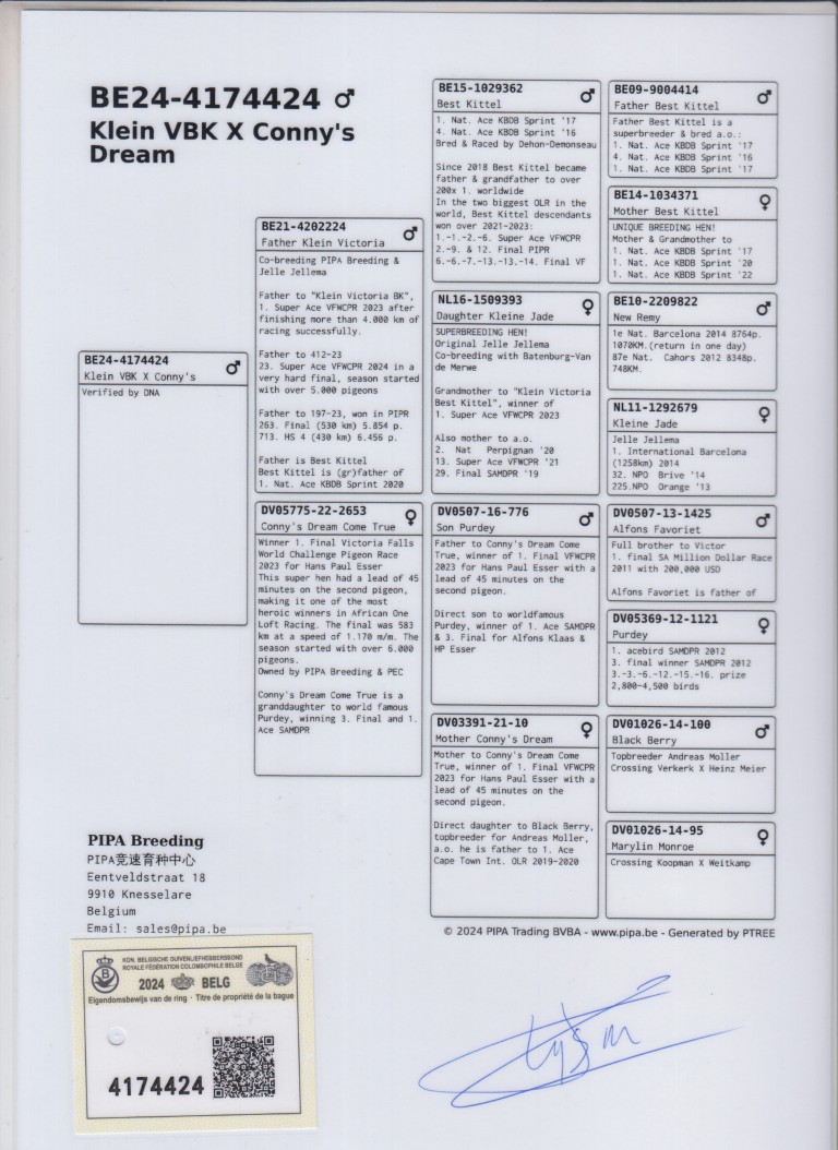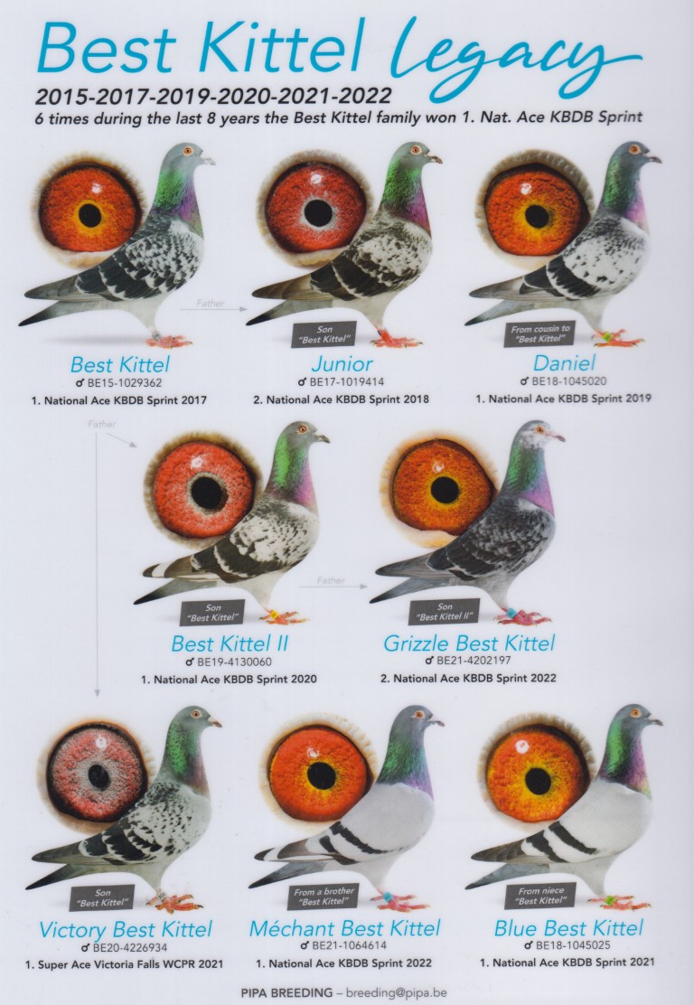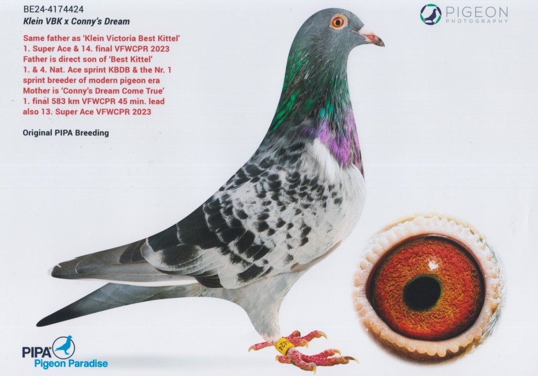 Uit: ”Father Klein Victoria”, vader 1. & 23. Super Asduif OLR Victoria Falls, zoon ”Best Kittel” x ”Conny’s Dream Come True”, 1. Finale OLR Victoria Falls (45 min. vooruit), moeder 5. Super Asduif & 8. Grand Average Victoria Falls