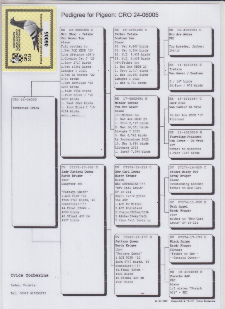 Uit: ”Brother New Tetske”, broer van ”New Tetske”, 1. Nat. Asduif Fond KBDB, 2. Olympiade duif, broer ”Tetske”, 1. Nat. Brive & 3x 1. Prov. x ”Lady Pattaya Queen”, dtr. ”Pattaya Queen”, 1. Asduif PIPR Pattaya 8.747 d.