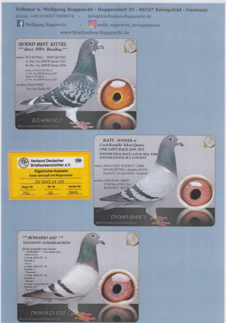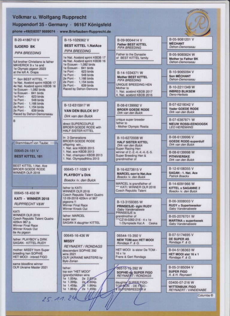 Uit: ”Sjoerd BK”, zoon ”Best Kittel”, 1. & 4. Nat. Asduif Sprint KBDB x ”Kati – Winner 2018”, 1. Finale OLR Czech Republic 967 d., uit klz. ”Rudy”, Gaby Vandenabeele, uit klz. ”Sagan”, P. Boeckx, 1. Nat. Asduif Sprint KBDB