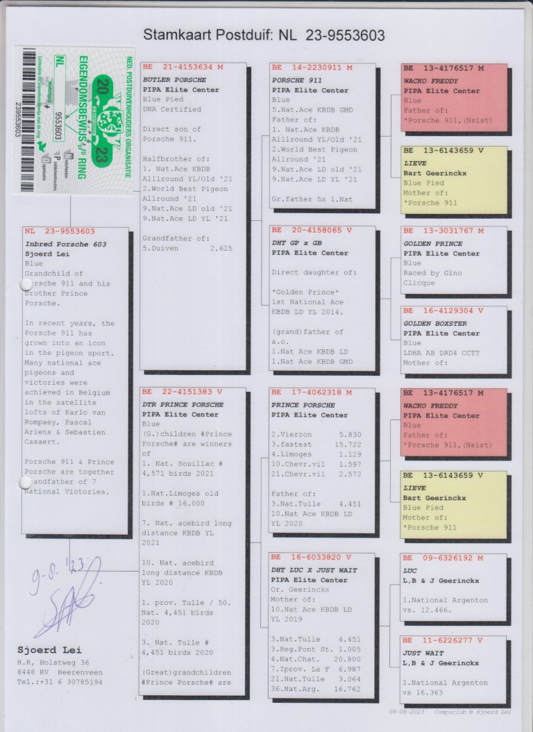 Uit: ”Butler Porsche”, gr-vader 5.-2.625 d., zoon ”Porsche 911”, 5. Nat. Asduif KBDB & PEC Superkweker, uit dochter ”Golden Prince”, 1. Nat. Asduif Fond KBDB x ”Dtr. Prince Porsche”, dochter ”Prince Porsche”, OLR Wonderkweker