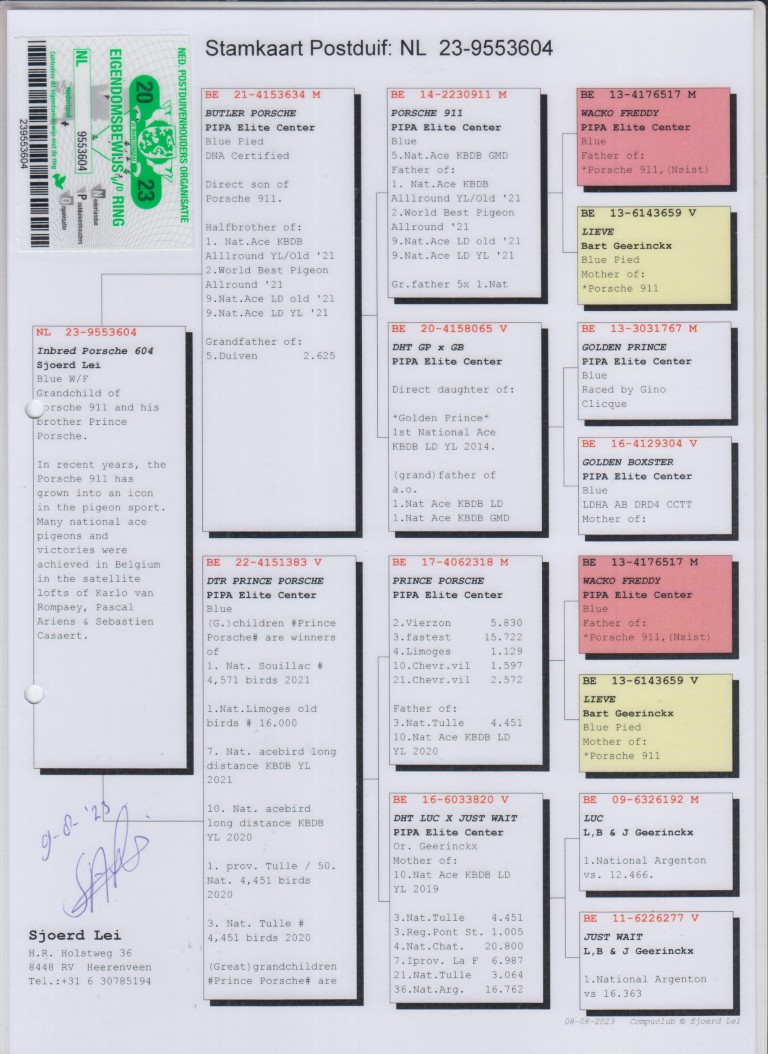 Uit: ”Butler Porsche”, gr-vader 5.-2.625 d., zoon ”Porsche 911”, 5. Nat. Asduif KBDB & PEC Superkweker, uit dochter ”Golden Prince”, 1. Nat. Asduif Fond KBDB x ”Dtr. Prince Porsche”, dochter ”Prince Porsche”, OLR Wonderkweker