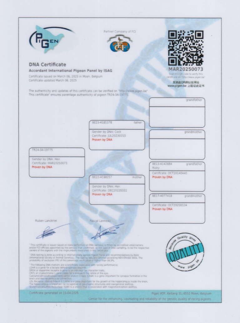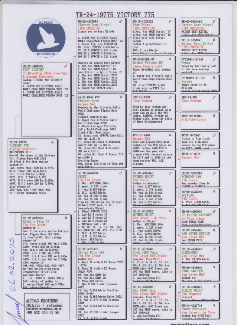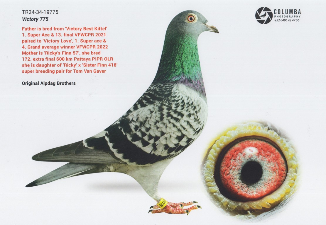 Uit: ”Best Victory”, zoon ”Victory Best Kittel”, 1. Super Asduif Victoria Falls & ”Victory Love”, 1. Super Asduif Victoria Falls x ”Ricky’s Finn 57”, Tom van Gaver, zus kweker 1. Extra Finale PIPR Pattaya, dtr. ”Ricky” & ”Sister Finn 418”