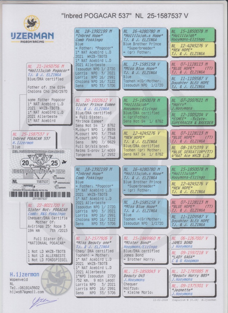 Uit: ”Hallilujah Pogacar”, vader 2.-2.970 d., zoon ”Nationaal Pogacar”, , 3x 1. Nat. Asduif Dagfond, dubbele gr-vader 1. Finale OLR PIPR Pattaya x ”Sister Nat. Pogacar”, moeder 7. Race OLR Avirings 2.015 d., zus ”Nationaal Pogacar”