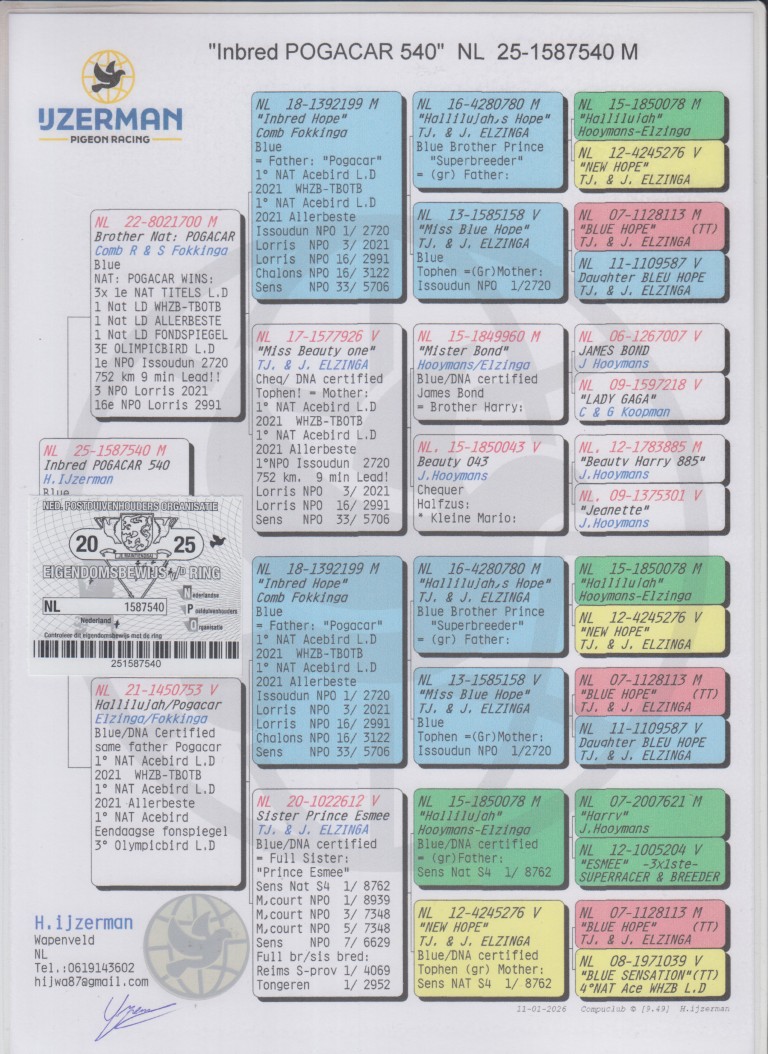 Uit: ”Brother Nat. Pogacar”, broer ”Nationaal Pogacar”, 3x 1. Nat. Asduif Dagfond, 3. Olympiade duif Cat. Dagfond, dubbele gr-vader 1. Finale OLR PIPR Pattaya x ”Hallilujah / Pogacar”, 1/2 zus ”Nat. Pogacar”