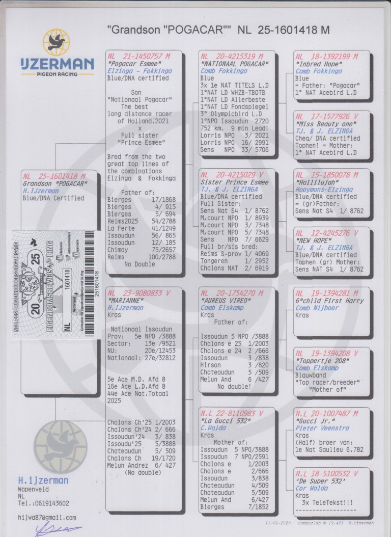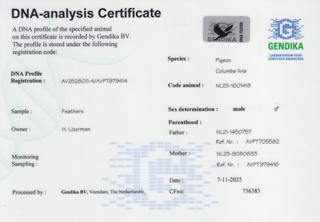 Uit: ”Pogacar Esmee”, zoon ”Nationaal Pogacar”, 3x 1. Nat. Asduif Dagfond, 3. Olympiade duif Cat. Dagfond, dubbele gr-vader 1. Finale OLR PIPR Pattaya 6.101 d. 2025 x ”Marianne”, 1.-2003 d., 2.-666 d., 3.-838 d., 5. NPO 3.888 d.
