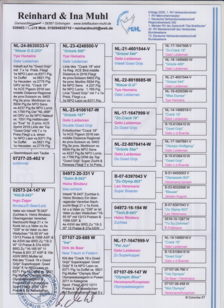 Uit: ”Nieuw G.G. 033”, inteelt ”Goed Grijs”, 7x 1. Prijs & 1. NPO Laon 6.371 d., nazaten winnen 7x 1. Nat. Asduif x ”Kld. B-043”, uit zoon “B-043”, stamvader, zoon “Olympiade 003”, uit dochter ”Pei Jun”, zoon ”Goed Grijs”