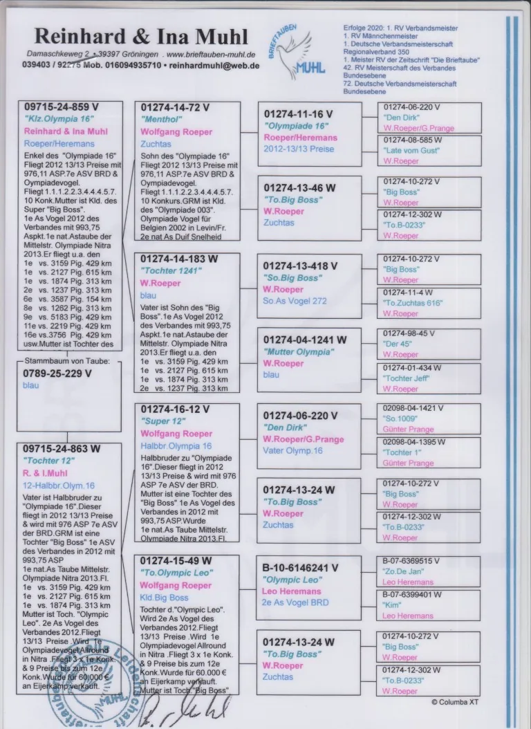 Uit: ”Klz. Olympia 16”, uit zoon ”Olympiade 16”, Olympiade duif & 7. Nat. Asduif, lijn ”Olympiade 003”, Olympiade duif bij Leo Heremans x ”Tochter 12”, uit 1/2 broer ”Olympiade 16”, Olympiade duif & 7. Nat. Asduif