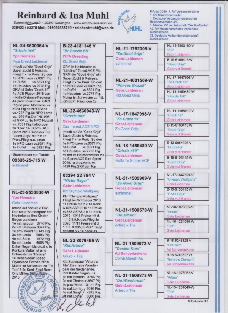Uit: ”Grizzle 064”, Super inteelt ”Goed Grijs”, 7x 1. Prijs & 1. NPO Laon 6.371 d., nazaten winnen 7x 1. Nat. Asduif x ”Ype Hemstra”, uit klz. x kld. Superkoppel ”Arturo” & ”Tila”, uit klz. ”Goed Grijs”, 7x 1. Prijs & 1. NPO Laon 6.371 d.