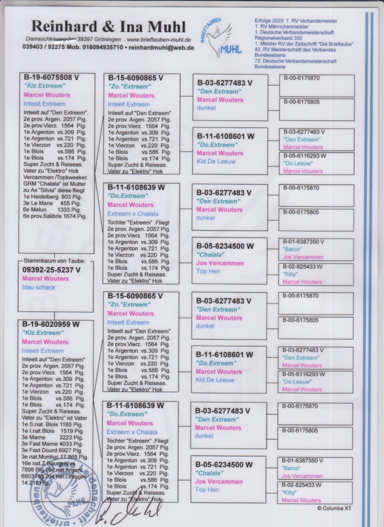 Uit: ”Klz. Extreem”, uit zoon & dochter ”Extreem”, 5x 1. Prijs & Absolute Superkweker, 2. Prov. 2.057 d., 2. Prov. 1.564 d. & vader ”Elektro”, Stamvader Hok Jos Vercammen x ”Klz. Extreem”, uit zoon & dochter ”Extreem”