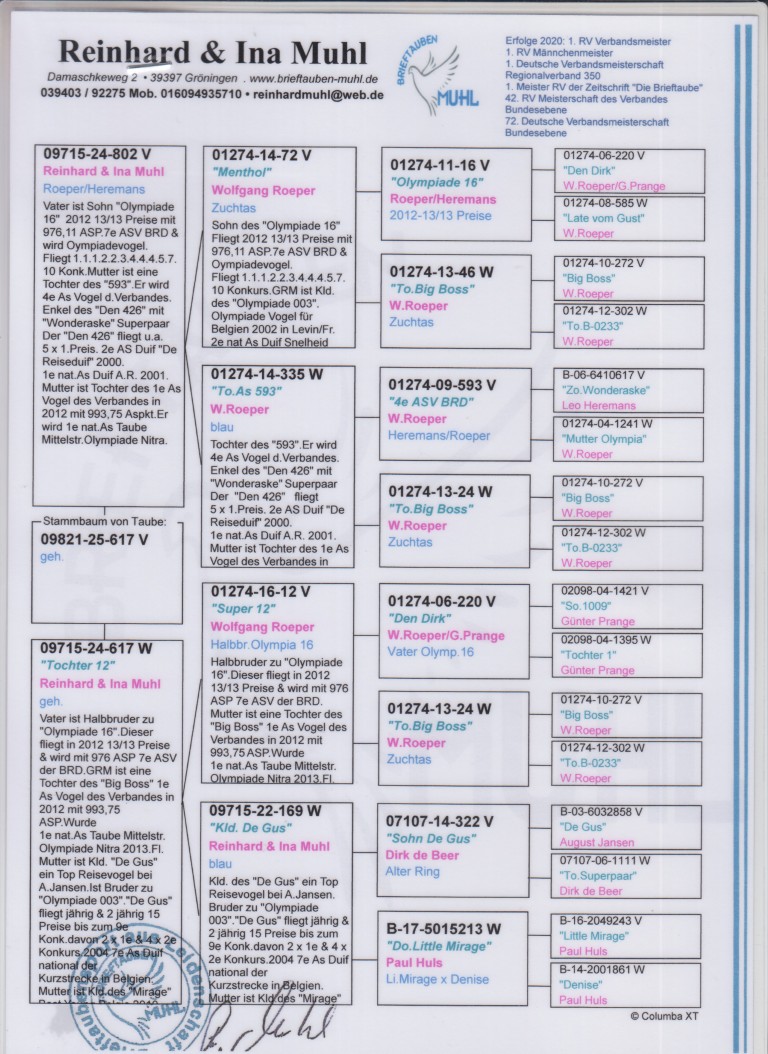 Uit: ”Roeper / Heremans”, uit zoon ”Olympiade 16”, Olympiade duif & 7. Nat. Asduif, uit dochter ”De 593”, 4. Nat. Asduif x ”Tochter 12”, uit 1/2 broer ”Olympiade 16”, Olympiade duif & 7. Nat. Asduif, uit klz. ”Big Boss”