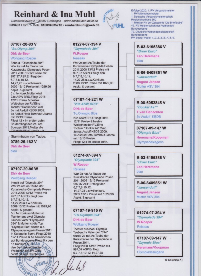 Uit: ”So. Olympic 394”, zoon ”Olympiade 394”, 2. Nat. Asduif & Olympiade duif, uit broer ”Den Euro”, 1. Europese Asduif x ”Dirk de Beer”, inteelt dochter ”Olympiade 394”, 2. Nat. Asduif & Olympiade duif