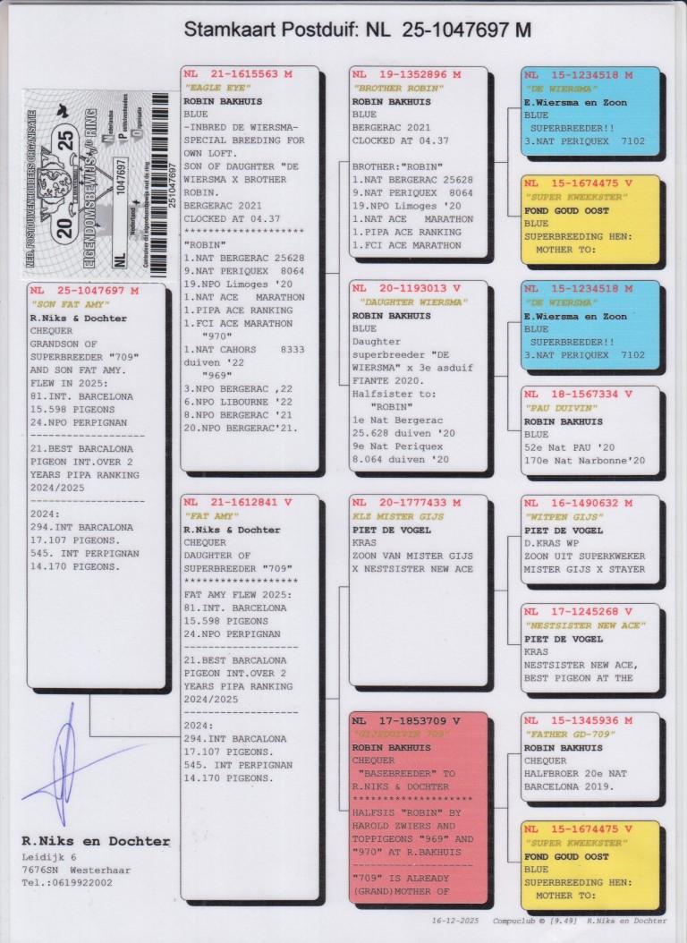 Uit: ”Eagle Eye”, uit zoon & dochter ”De Wiersma”, vader ”Robin”, 1. Nat. Asduif Marathon NPO x ”Fat Amy”, 21. Int. Asduif Barcelona 2024/2025, 24. NPO Perpignan, 81. Int. Barcelona, 294. Int. Barcelona, Barcelona = 1255 km