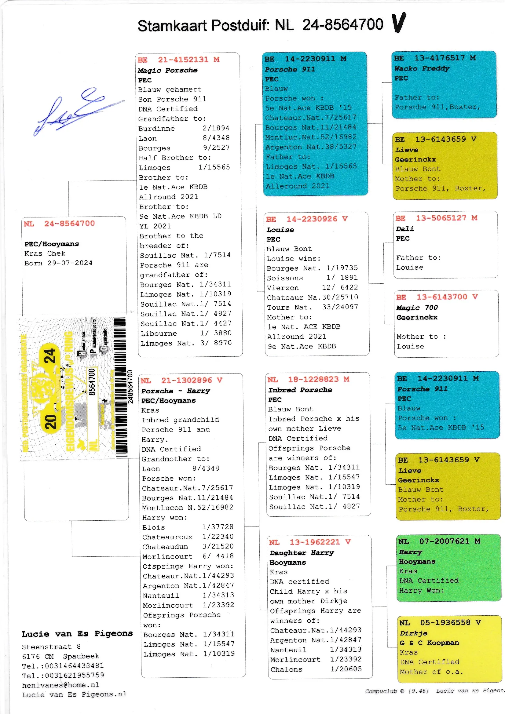 Uit: ”Magic Porsche”, zoon ”Porsche 911”, 5. Nat. Asduif KBDB, zoon ”Louise”, 1. Nat. Bourges 19.735 d. x ”Porsche-Harry”, uit zoon ”Porsche 911”, uit dochter ”Harry”, 1. Nat. Asduif Dagfond