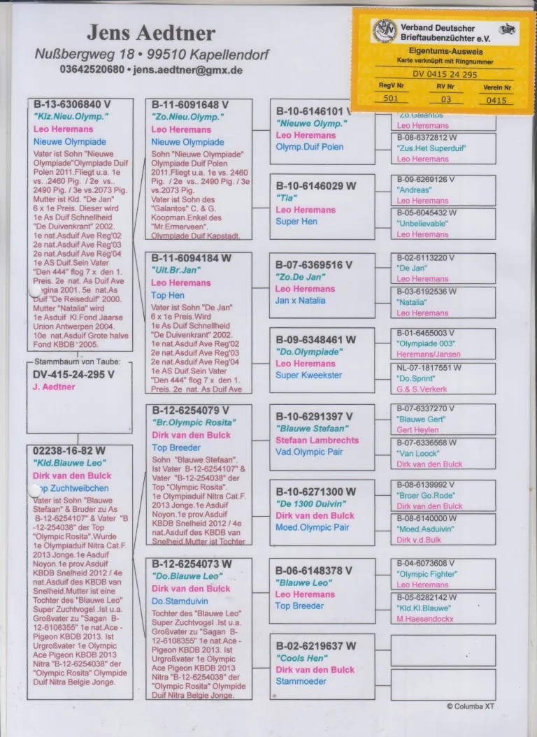 Uit: “The 840”, uit zoon “Nieuwe Olympiade”, Olympiade Duif Polen & “Tia” & kl.dochter “De Jan”, “Natalia”, “Olympiade 003” x “The 82”, uit “Brother Olympic Rosita”, uit “Blauwe Stefaan & De 1300 Duivin” & dochter “Blauwe Leo & Cools Hen” !!!!!!!
