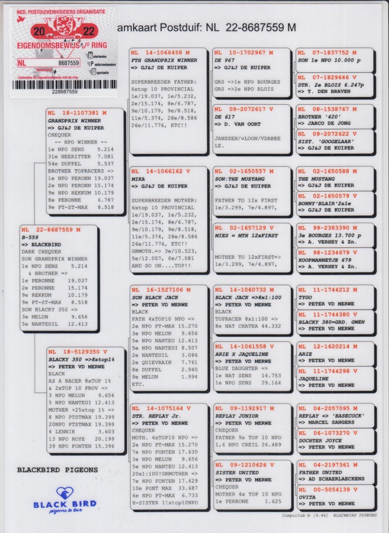 Uit: “Grandprix Winner 381”, 1. NPO Sens 5.214d., 31.-7.081d., 54.-5.537d., broer 1.-19.037d., 2.-15.174d., 8.-6.787d., 9.-10.179d., 9.-8.518d. x “Black 350”, 3. NPO 9.656d., 5. NPO 12.413d., moeder 4.+5.+8.+13.+39. NPO, uit “Son Black Jack & dtr. Replay Jr.”, Peter v.d. Merwe.