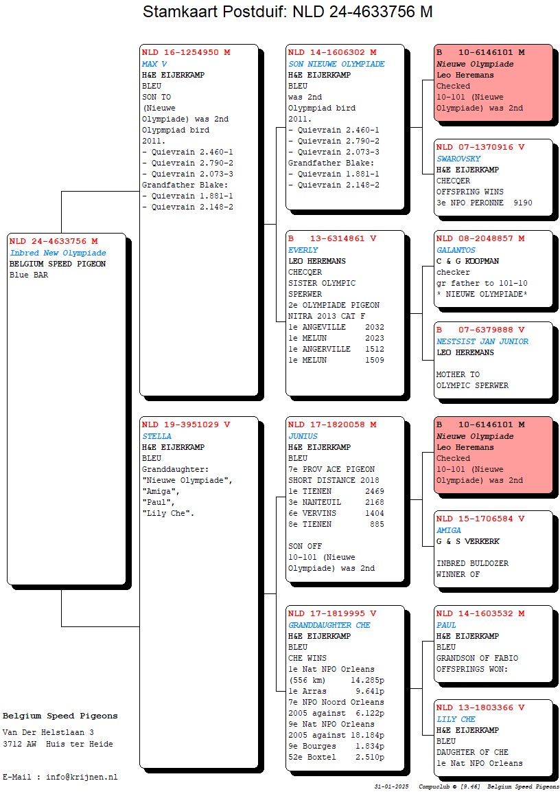 Uit: “Max V”, uit zoon “Nieuwe Olympiade” & “Everly”, zus “Olympic Sperwer”, uit “Galantos & zus Jan Junior” x “Stella”, uit dochter “Nieuwe Olympiade” & kl.dochter “Che”.