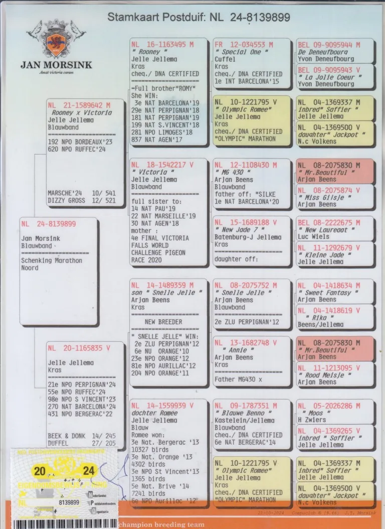 Uit “Zoon Rooney”, broer “Romy”, 3.-29.-181.-199.-281.- National / “Victoria”, zus: 14.-22.-30.-Nat. x “20-835”, Jelle Jellema 21.-55.-98.- NPO / Nat. kld. “Snelle Jelle”, 2. Nat. ZLU Perpignan x “D. Romee”, 3.-3.-3.-5.-6. NPO/Nat.