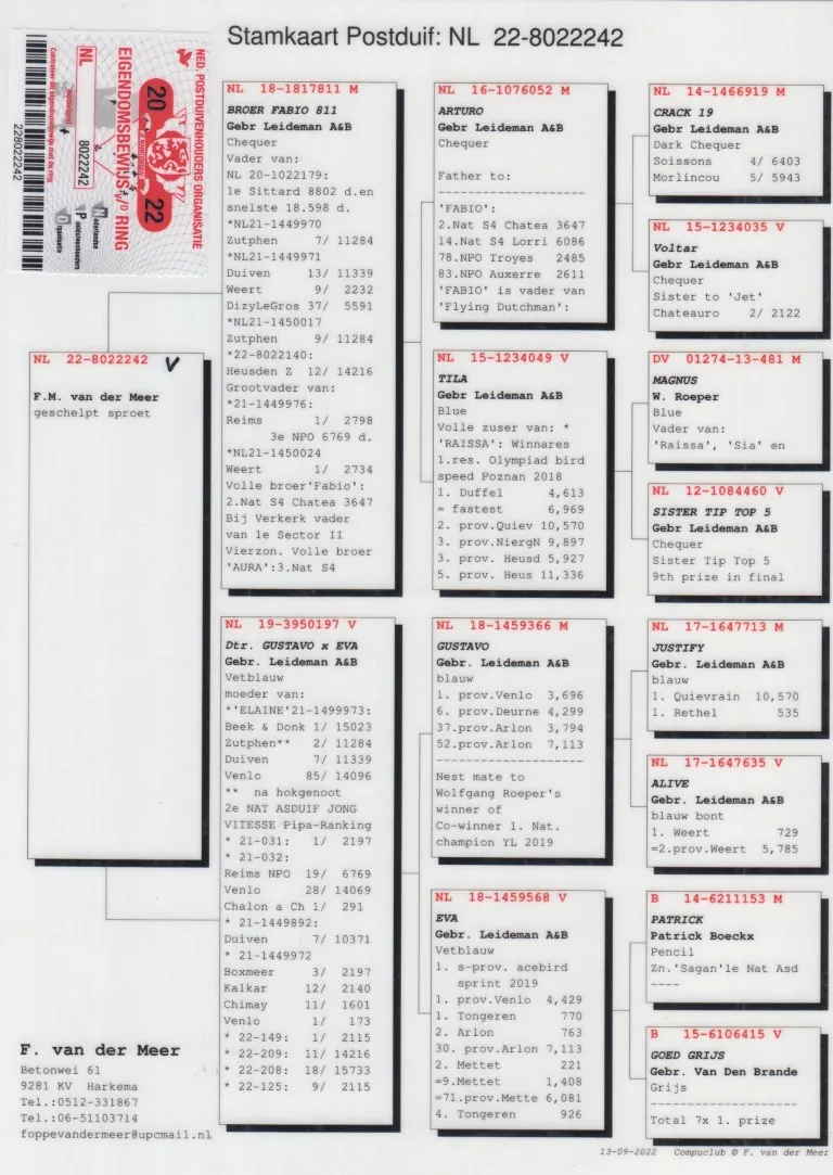 Uit: ”Matteo”, (Gr)vader 1.-18.598 d., 1.-6.450 d., 1.-5.095 d., 1.-4.875 d. x ”Eva-Lotta”, moeder 1.-15.078 d., 1.-2.197 d., 1.-2.115 d., gr-moeder 1. Olympiade duif, 1. Int. Asduif Midfond FCI, 1.-5.267 d., 1.-5.066 d., 1.-4.252 d.