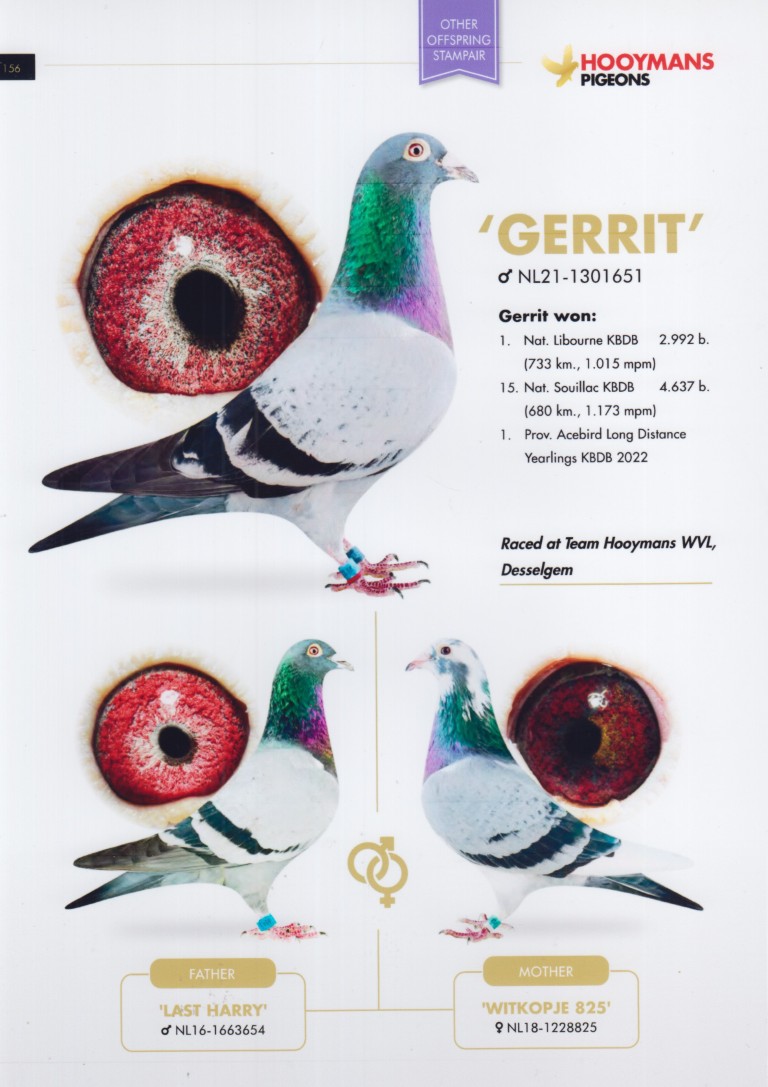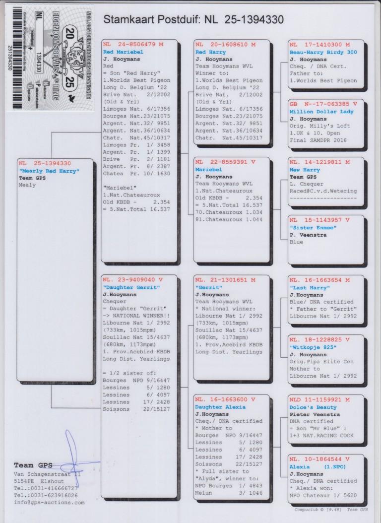 Uit: ”Red Mariebel”, zoon ”Red Harry”, 1. Nat. Asduif Fond FCI, zoon ”Mariebel”, 1. Nat. Chateauroux 2.354 d. x ”Daughter Gerrit”, dochter ”Gerrit”, 1. Nat. Libourne 2.992 d. (5 min. vooruit), 1. Prov. Asduif Fond Jaarlingen