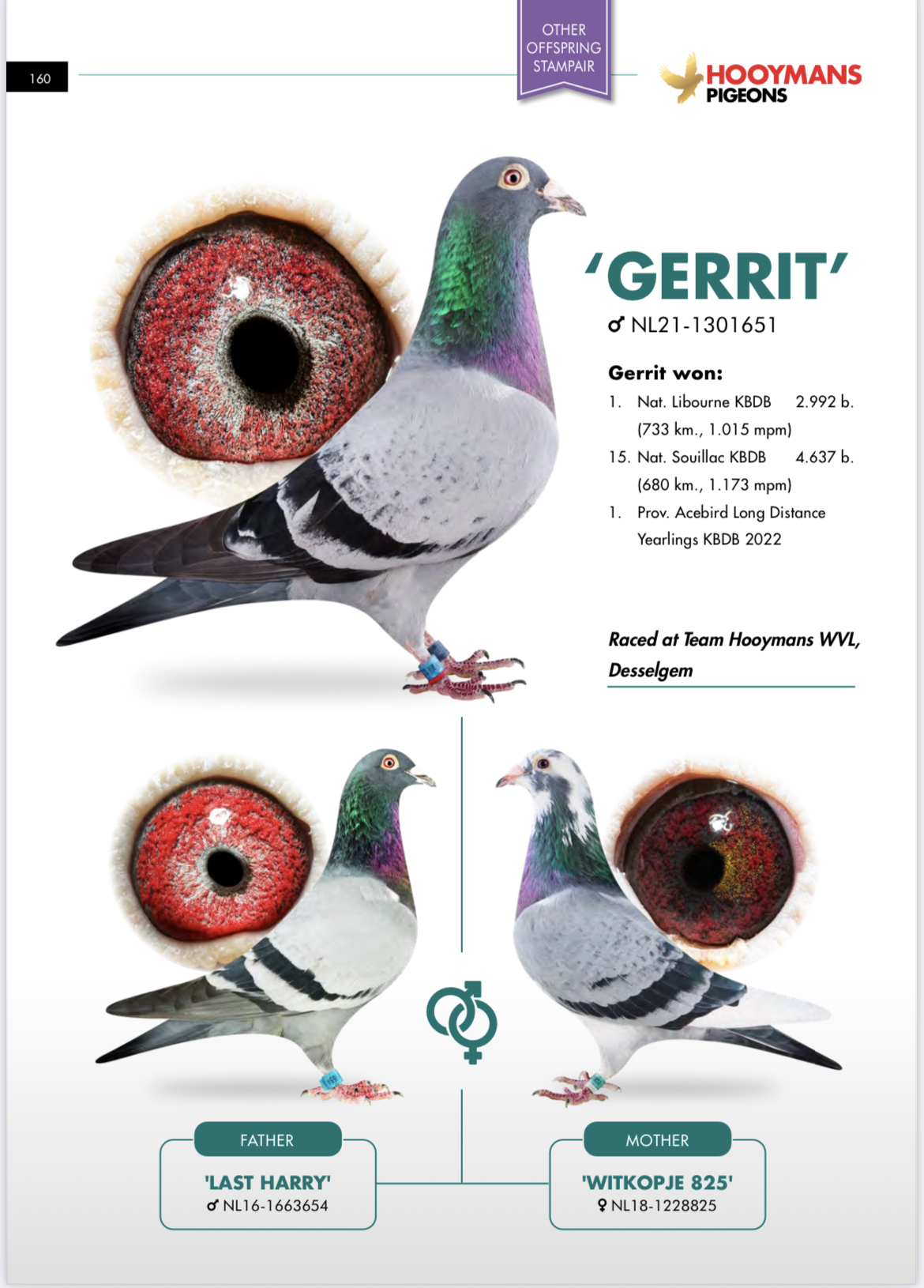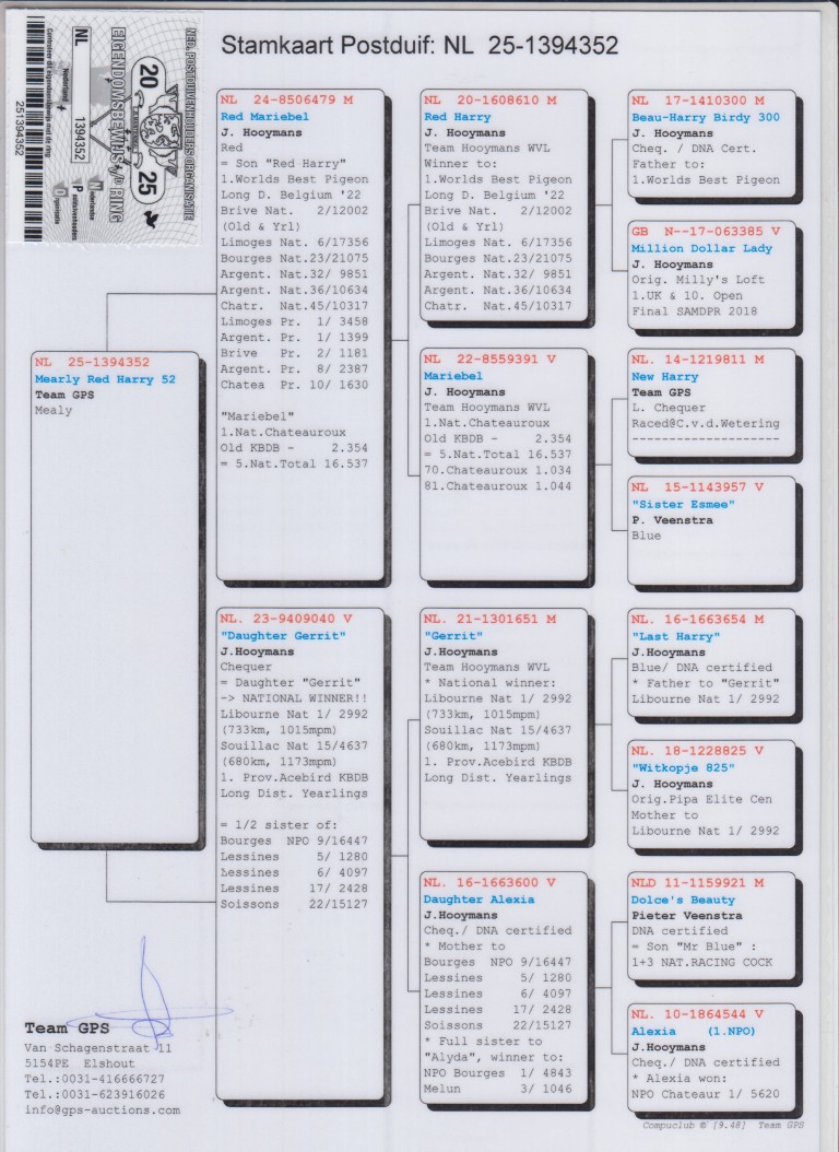 Uit: ”Red Mariebel”, zoon ”Red Harry”, 1. Nat. Asduif Fond FCI, zoon ”Mariebel”, 1. Nat. Chateauroux 2.354 d. x ”Daughter Gerrit”, dochter ”Gerrit”, 1. Nat. Libourne 2.992 d. (5 min. vooruit), 1. Prov. Asduif Fond Jaarlingen