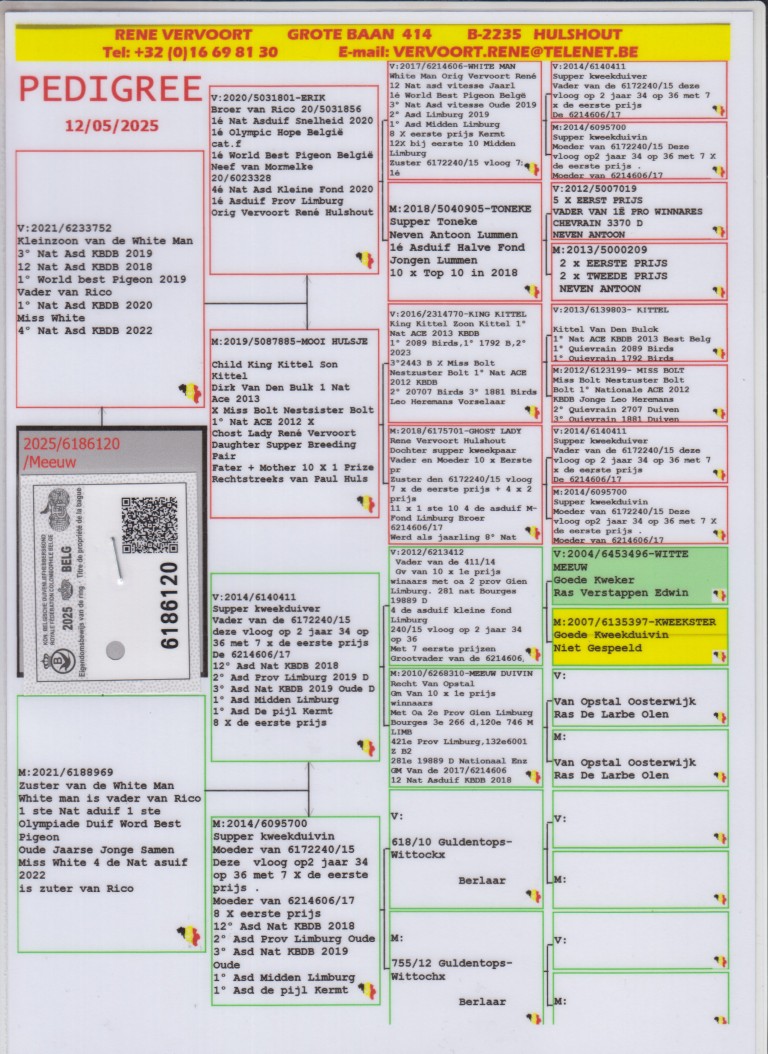 1. Olympiadeduif World Best Pigeon Oude , Jaarse, Jonge, Samen ‘Miss White’, 4. Nat. Asduif 2022.