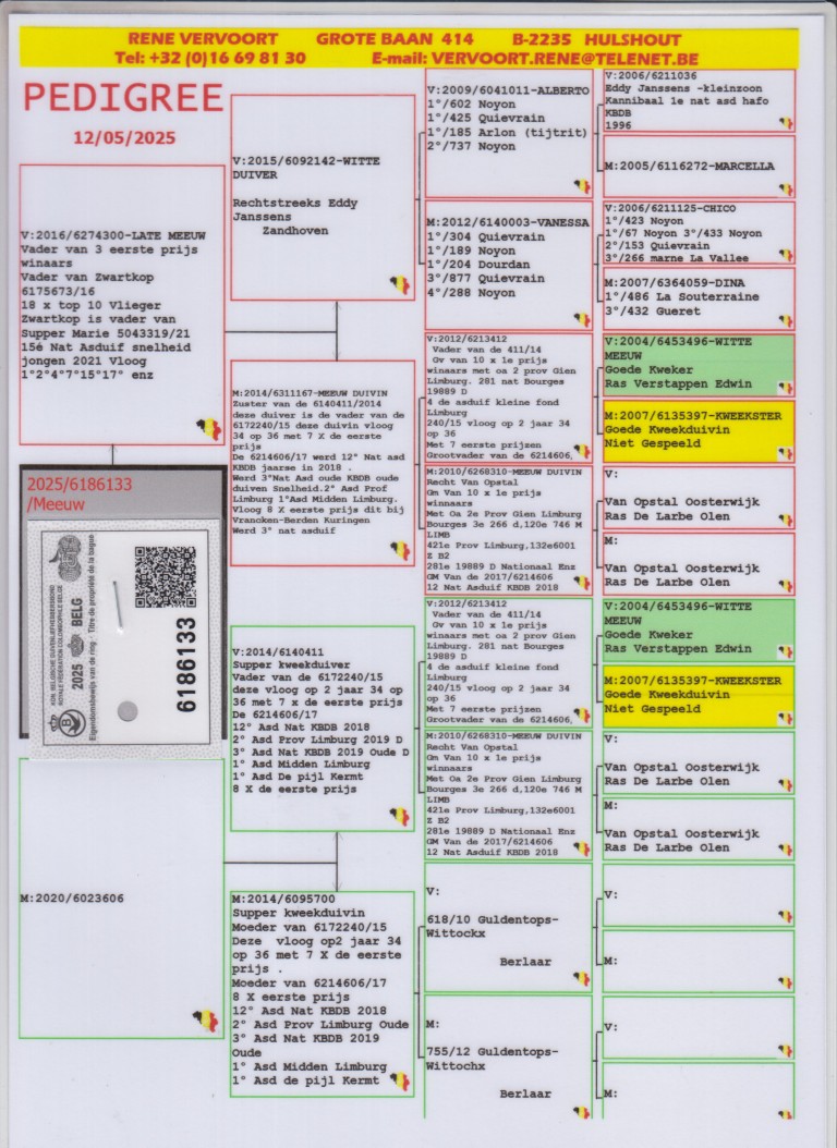 Uit: ”Late Meeuw”, vader 3x 1. Prijs Winnaar, gr-vader 15. Nat. Asduif Sprint KBDB x ”De 606”, zus ”White Man”, 1. Nat. Asduif & vader ”Olympic Rico”, 1. Nat. Asduif Sprint Jonge KBDB, 1. Int. Asduif FCI, 1. Olympiade duif