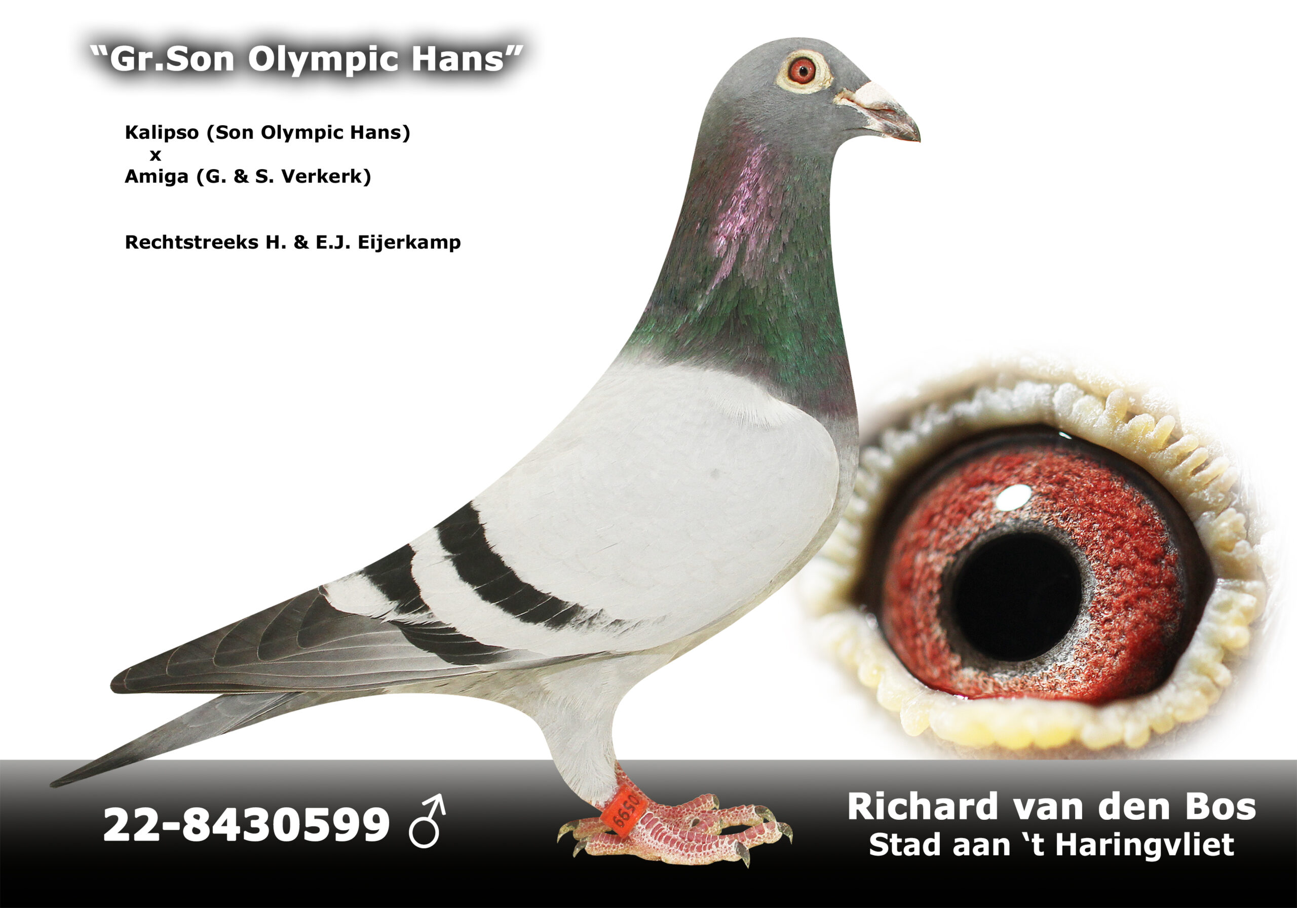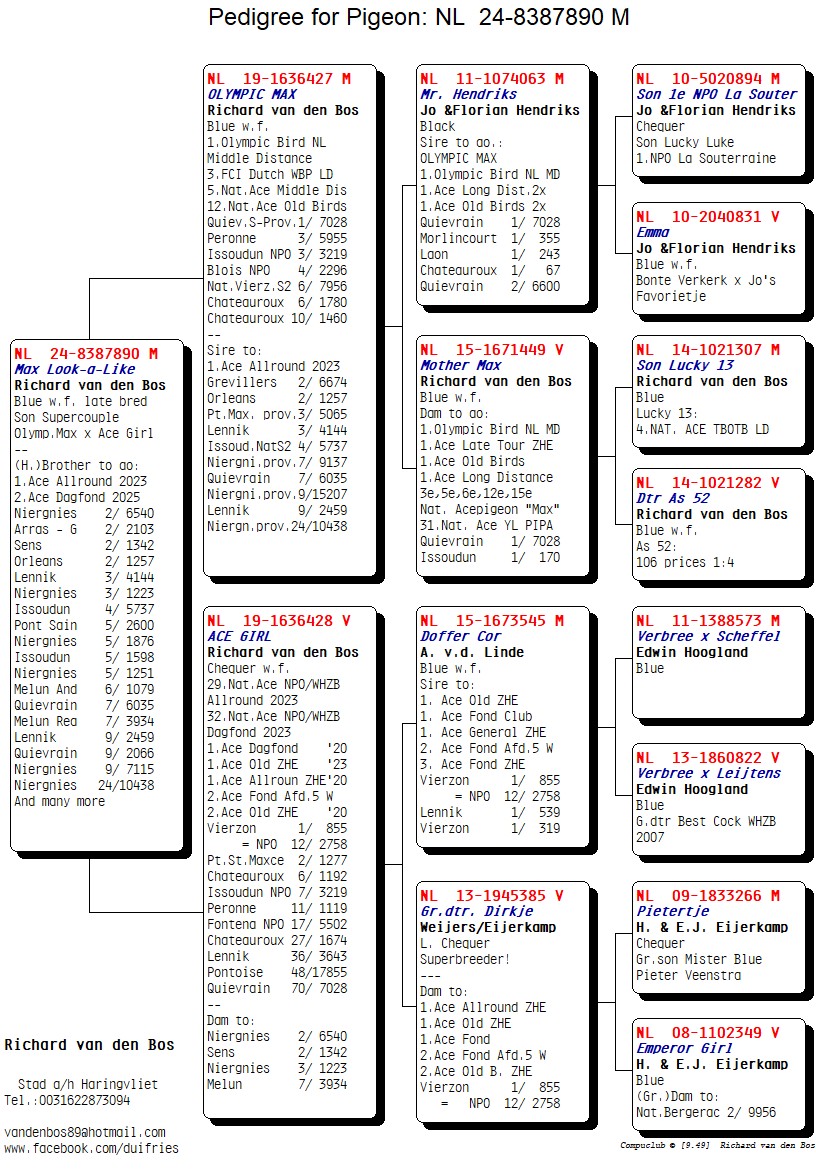 Uit: ”Olympic Max”, 1. Olympiade Cat. Midfond, 1.-7.028 d., 3.-5.955 d., 3. NPO 3.219 d., vader 1. Asduif Allround x ”Ace Girl”, 3x 1. Asduif, 1.-855 d., 2.-1.277 d., 6.-1.192 d., moeder 2.-6.540 d., 2.-1.342 d., 3.-1.223 d., 7.-3.934 d.