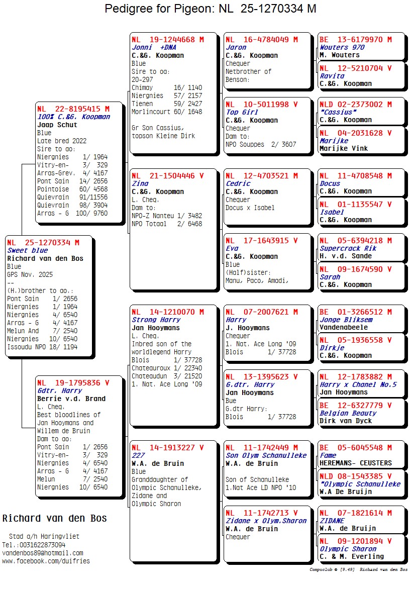 Uit: ”100% Koopman”, vader 1.-1.964 d., 3.-329 d., 4.-4.167 d., 14.-2.656 d., lijn ”Kleine Dirk” x ”Grdtr. Harry”, moeder 1.-2.656 d., 3.-329 d., 4.-6.540 d., 4.-4.167 d., 7.-2.540 d., 10.-6.540 d. uit zoon ”Harry”, 1. Nat. Asduif