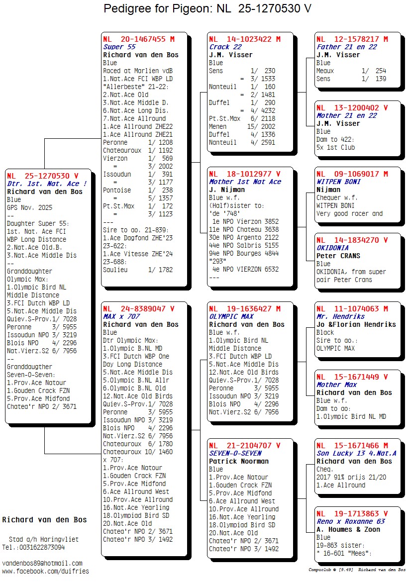 Uit: ”Super 55”, 1. Nat. Asduif Dagfond FCI, 2.-3.-6.-7. Nat. Asduif, 1.-1.208 d., 1.-1.192 d., 2x 1. Asduif Allround, vader 1. Asduif ZHE Dagfond, 1. Asduif ZHE Sprint, 1.-1.782 d. x ”Max x 707”, dtr. ”Olympic Max” & ”Seven-O-Seven”