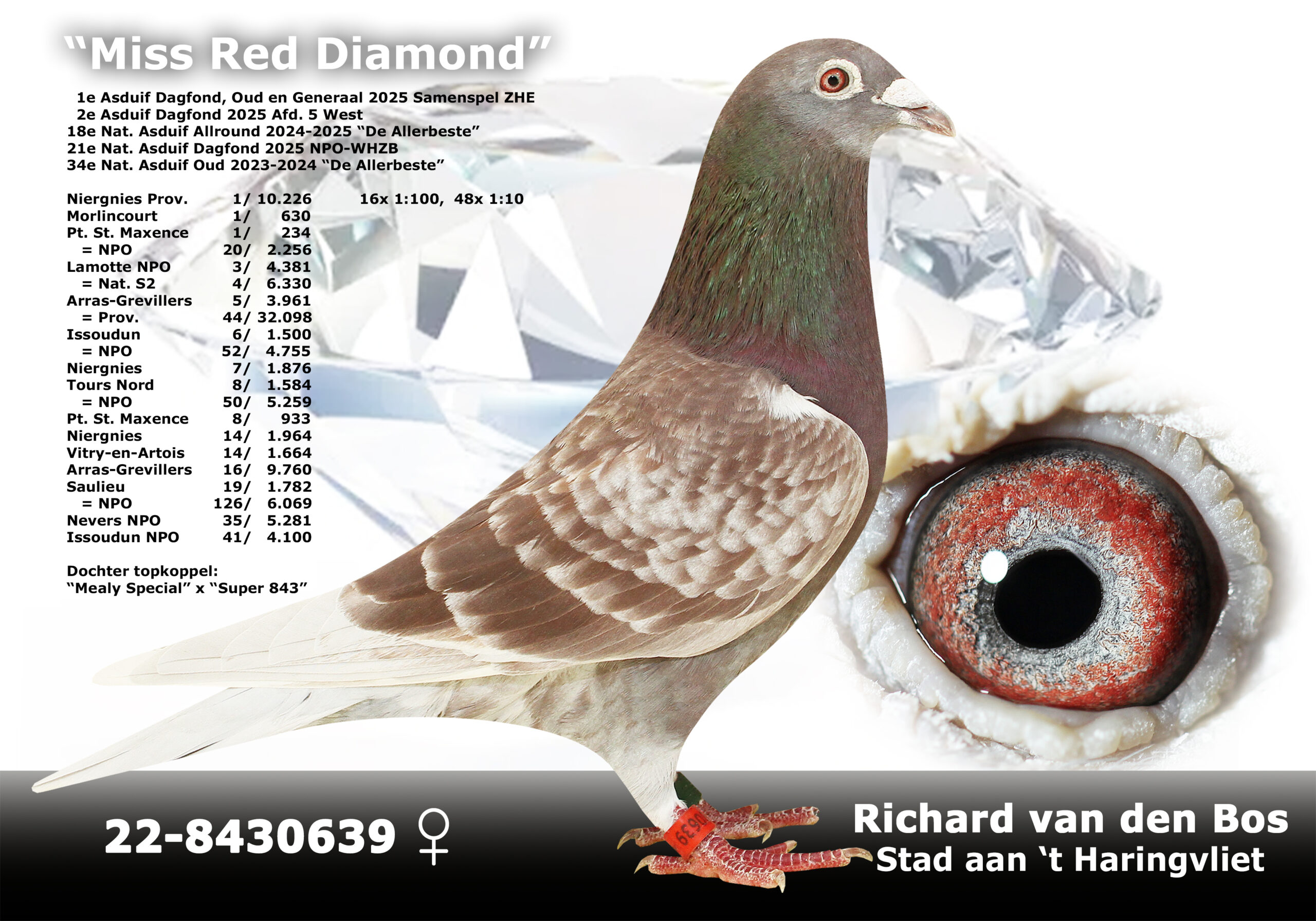 Uit: ”Halfbrother Super 55”, 4. Asduif Allround, 4.-1.647 d., 8.-2.066 d., 8.-476 d., 14. NPO 1.584 d. x ”Miss Blue Diamond”, 1. Semi-Prov. 6.035 d., 1. Semi-Prov. 2.600 d., 1.-305 d., 3.-5.412 d., 5.-1.964 d., 31.-9.760 d.