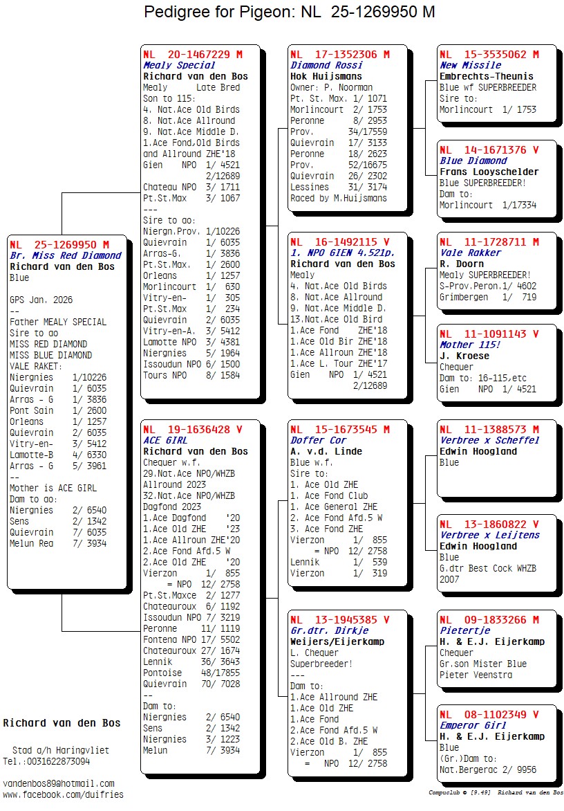 Uit: ”Mealy Special”, vader 1. Prov. 10.226 d., 1.-6.035 d., 1.-3.836 d., 1.-2.600 d., 1.-1.257 d. x ”Ace Girl”, 3x 1. Asduif, 1.-855 d., 2.-1.277 d., 6.-1.192 d., 7.-3.219 d., moeder 2.-6.540 d., 2.-1.342 d., 3.-1.223 d., 7.-3.934 d.
