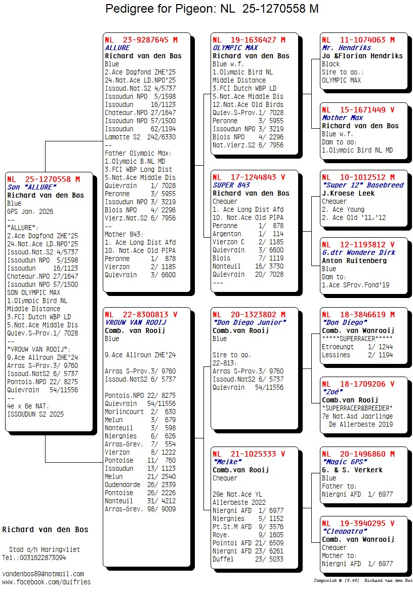 Uit: ”Allure”, 2. Asduif Dagfond ZHE, 4. Nat. Issoudun 5.737 d., 5. NPO Issoudun 1.598 d., zoon ”Olympic Max” x ”Vrouw van Rooij”, 9. Asduif Allround ZHE, 2.-630 d., 3. Semi-Prov. 9.760 d., 3.-679 d., 6. Nat. Issoudun 5.737 d.