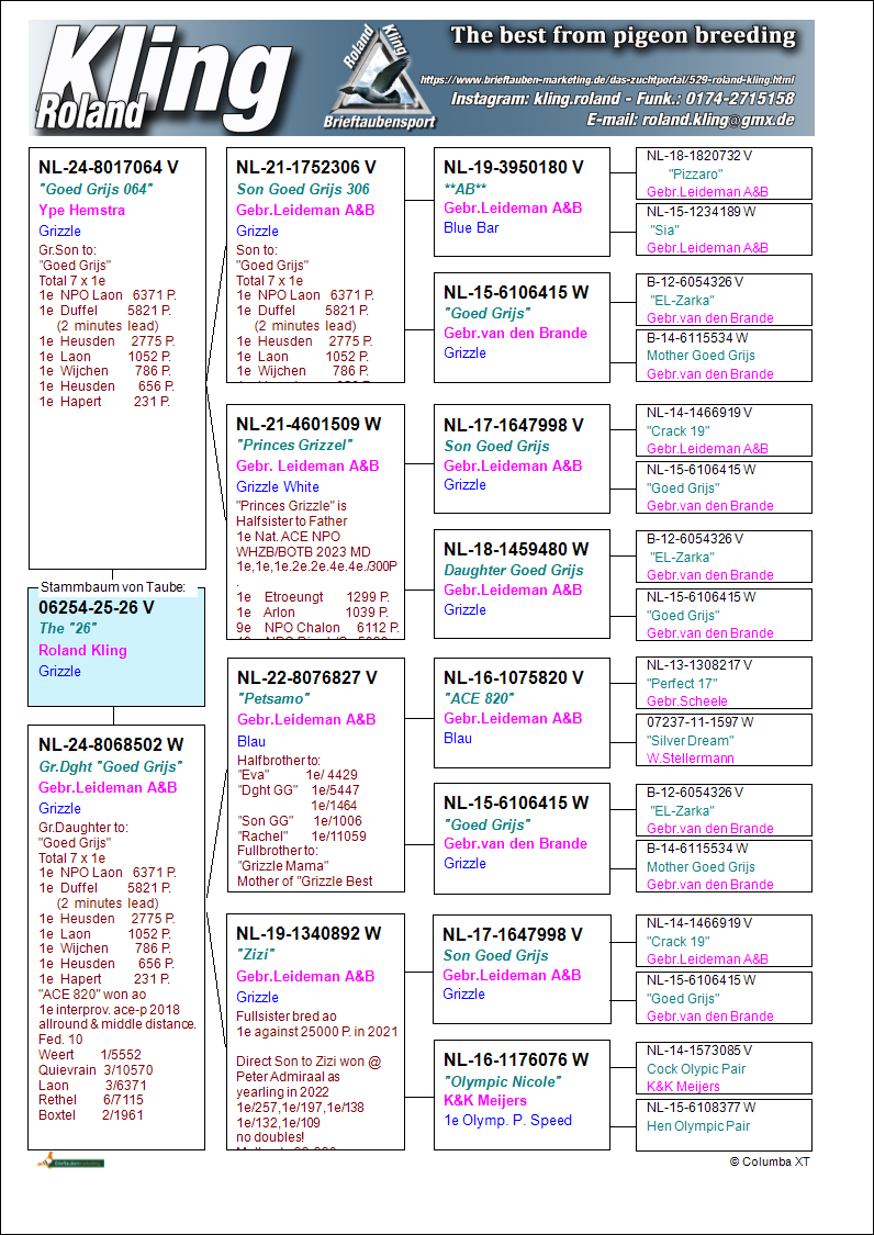 Uit: ”Goed Grijs 064”, uit zoon ”Goed Grijs”, 7x 1. Prijs & 1. NPO Laon 6.371 d., uit dochter ”Son Goed Grijs 998” x ”Grdtr. Goed Grijs”, uit zoon ”Goed Grijs”, nazaten winnen 7x 1. Nat. Asduif, uit dochter ”Son Goed Grijs 998”