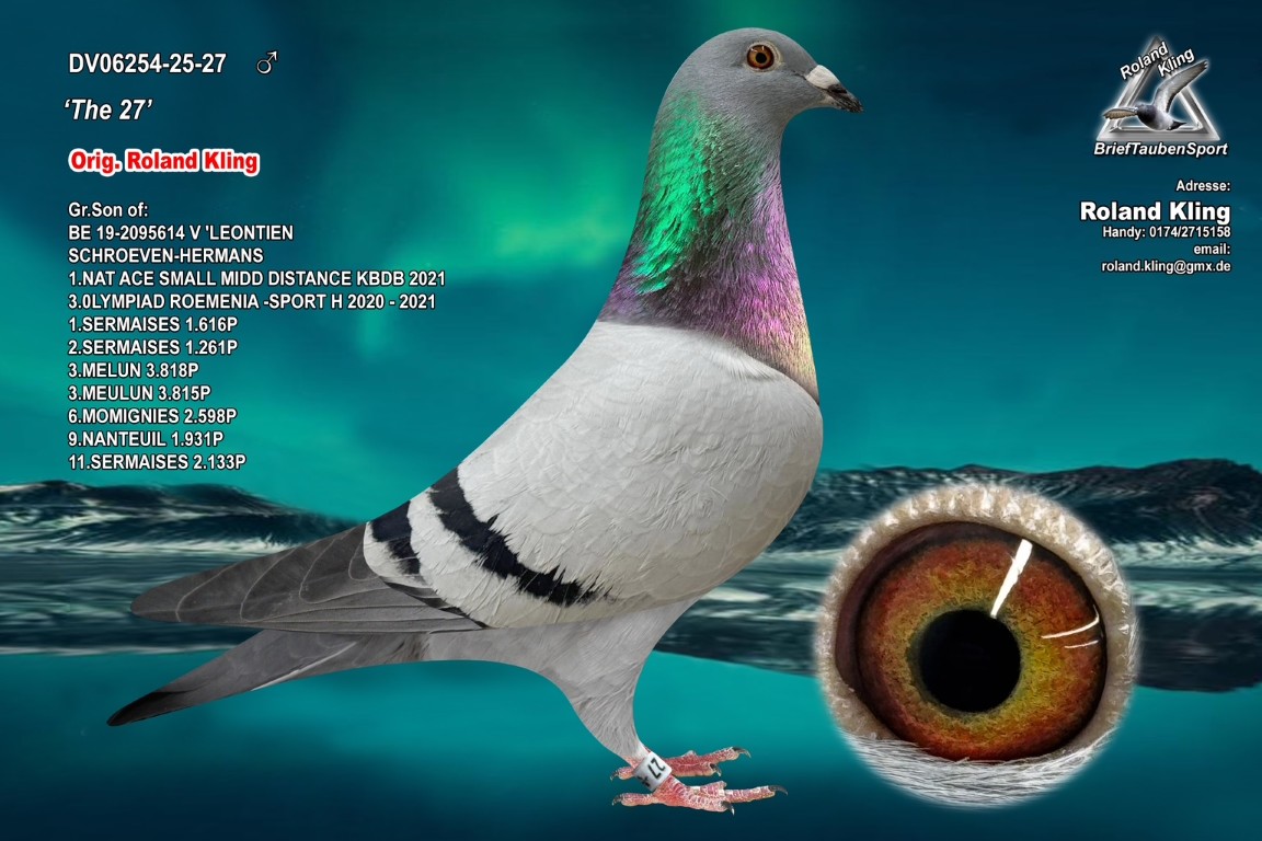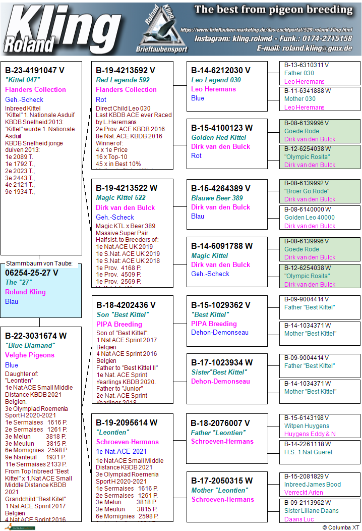 Uit: ”Kittel 047”, inteelt ”Kittel”, 1. Nat. Asduif Sprint KBDB & legendarische kweker, inteelt ”Olympic Rosita”, 1. Olympiade x ”Blue Diamond”, dochter ”Leontien”, 1. Nat. Asduif KBDB & 3e Olympiade duif, uit zoon ”Best Kittel”