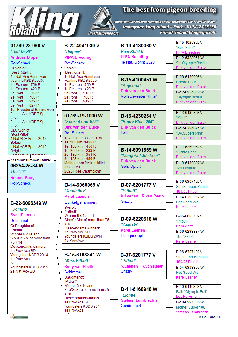 Uit: ”Red Devil”, uit zoon ”Best Kittel II”, 1. Nat. Asduif KBDB, uit zoon ”Angelina”, uit kld. ”Kittel”, 1. Nat. Asduif KBDB x ”Domino”, uit zoon & dochter ”Pitbull 777”, legendarische kweker, nazaten 6x 1. Nat. Asduif