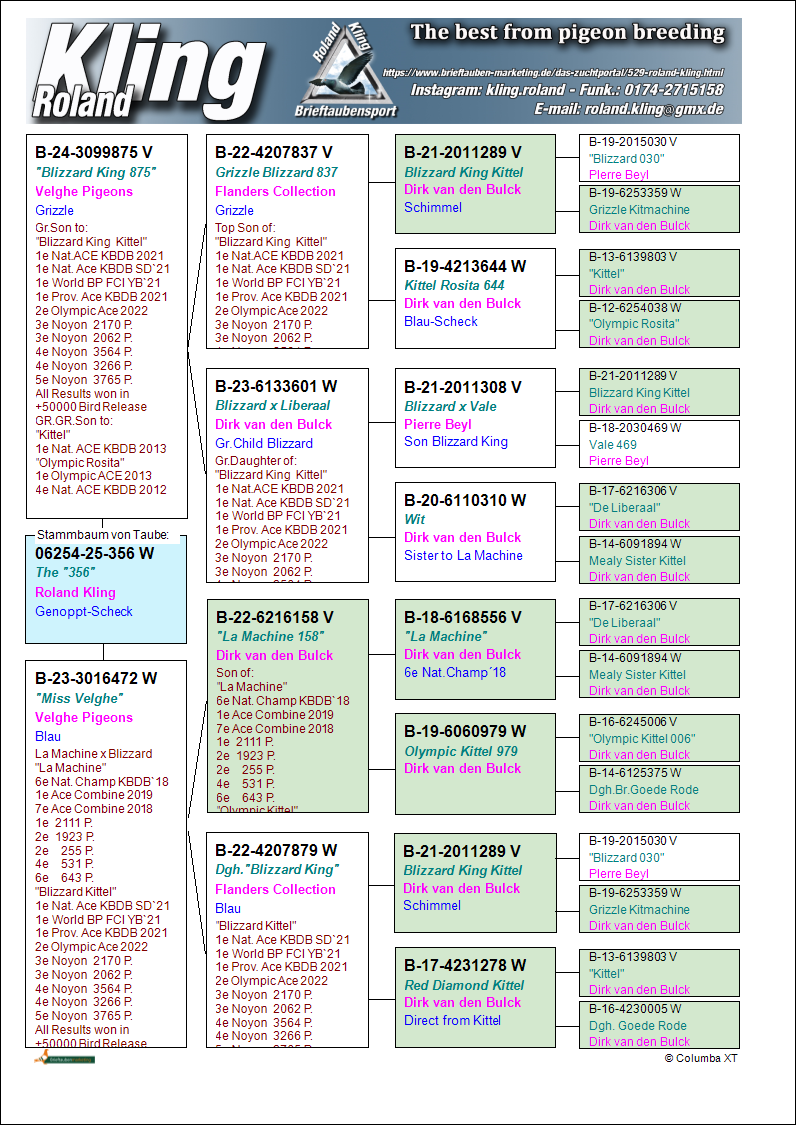 Uit: ”Blizzard King 875”, uit zoon & kld. ”Blizzard King Kittel”, 1. Nat. Asduif Sprint KBDB & vader ”Unicum Blizzard”, 1. Nat. Asduif Sprint KBDB x ”Miss Velghe”, uit dochter ”Blizzard King Kittel”, 1. Nat. Asduif Sprint KBDB